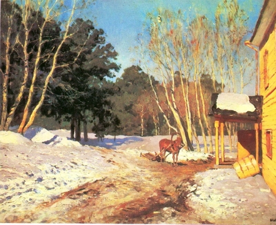 Он написал ее в 1895 году, находясь в Горке - имении своих знакомых Турчаниновых. Кому теперь незнакомо теплое солнце на рыхлом снегу этой привлекательнейшей картины? Кто не помнит мохнатой гнедой лошади, с таким удивительным цветовым тактом помещенной в центр полотна? И разве найдется кто-нибудь, кто не почувствовал мартовского холода в прозрачных снежных тенях?