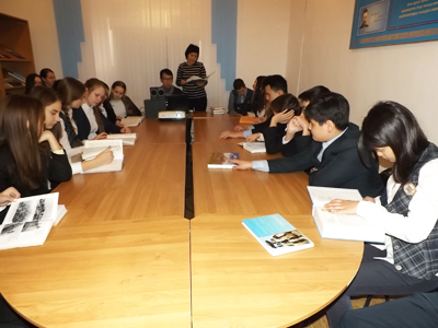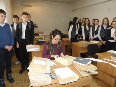 Работник архива – Шулакова Ш. А. поведала об истории создания архивной службы на территории Карагандинской области, об открытии 19 декабря 1937 года областного архива, его отделах, богатых фондах и опыте многолетней работы. Беседа сопровождалась демонстрацией фильма "Карагандинский обл. архив". Ребята с интересом рассматривали тематические сборники документов и материалов, библиографические справочники, подготовленные архивом: